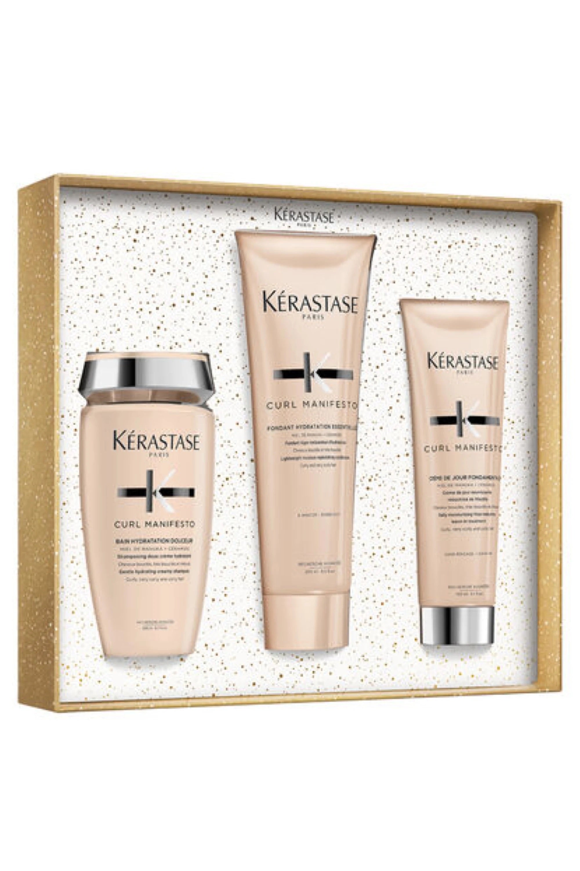 Ce coffret Curl Manifesto Kérastase réunit trois soins essentiels pour sublimer et nourrir les cheveux bouclés : un bain nettoyant, un fondant démêlant et une crème de jour protectrice. Ensemble, ils hydratent intensément, définissent les boucles tout en réduisant les frisottis, et protègent la fibre capillaire au quotidien. Idéal pour révéler une chevelure souple, brillante et parfaitement maitrisée, ce coffret expert offre une routine complète dédiée aux besoins spécifiques des cheveux bouclés.